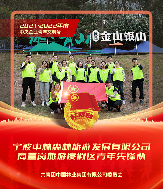 宁波中林森林旅游发展有限公司商量岗旅游度假区青年先锋队自成立以来,始终坚持“周到服务、拼搏奉献”的宗旨,以“敢打硬仗、务实向上”的工作态度奋斗在一线。队员们克服度假区的高海拔、复杂路况等不利条件常年坚守在岗。在度假区设计初期,队员们就将绿色环保节能的理念应用于项目建设的各个环节,为滑雪场、木屋酒店、生态民宿等项目建言献策,攻坚克难。为了保障新引进和培育的户外露营、自然研学、林下种植等新型业态按期上线,队员们主动放弃节假日休息时间,加班加点推进各项工作顺利落地。通过先锋队员们的努力,度假区在2022年荣获了“中国体育旅游精品项目”“浙江省森林康养基地”“浙江省十佳户外露营地”等十余项国家、省、市荣誉;2022年4月,度假区还获得了北京绿色交易所颁发的“碳中和证书”,切实把生态效益转化为经济效益,有力践行了“绿水青山就是金山银山”的理念。