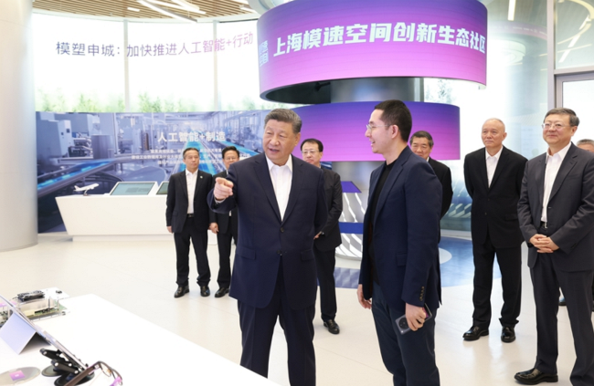“模速空间”是上海市打造的人工智能大模型专业孵化和加速平台,已入驻企业100余家。习近平来到这里,通过视频短片了解上海市人工智能产业发展情况,察看重点孵化企业的大模型产品展示,听取相关技术研发和企业生产经营介绍。习近平对上海积极发展人工智能取得的实效给予肯定。他指出,人工智能技术加速迭代,正迎来爆发式发展,上海要总结好以大模型产业生态体系孵化人工智能产业等成功经验,加大探索力度,力争在人工智能发展和治理各方面走在前列,产生示范效应。