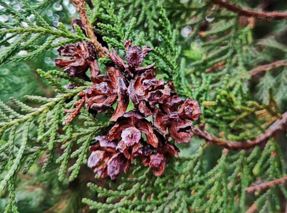株高可达20米,树皮浅灰褐色,呈薄片状剥落;小枝扁平,排成平面,形似鱼鳞,四季常青;叶为鳞形,交互对生,紧密贴附在小枝上,颜色深绿有光泽;球果近卵形,成熟时呈红褐色,种鳞木质化,开裂后露出种子,辨识度极高。