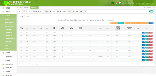 中林集团所属雷林公司经营管理子系统主要有电子地图、生产管理、资源管理、统计分析、考核评分等功能模块,实现全公司共用“一张图”、“一张表”的数据库信息管理模式。同时,实现共享、动态、实时的森林资源数据统一集中管理,林木种苗生产、新造林、中幼林抚育、伐区调查设计、科研林地管理等林业生产全过程实现线上管理。通过使用系统提供的PC管理端和手机移动端服务,管理员能及时收集各林队反馈信息,定期将有关工作安排、通知信息等发布到手机移动终端上,指导调度护林员、管理员开展工作,实现资源管理、生产计划、生产管理、通知公告、巡山护林、案件上报等全程无纸化掌上办公,并依托云计算平台和大数据进行综合分析,对历年海量森林资源和林业生产经营数据进行整合,自动生成综合指标图表,实现森林资源和林业生产经营操作流程规范化、信息可视化,杜绝人为统计出错率,为宏观决策提供分析依据和辅助支撑,提高管理决策能力。