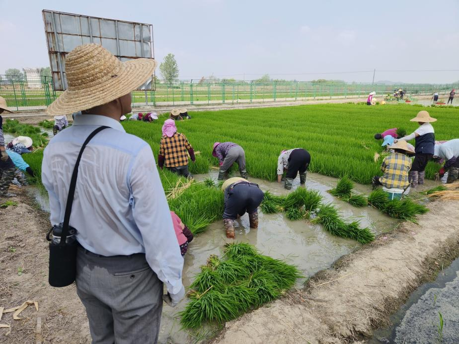 在江苏中江种业国家杂交水稻育种创新基地现场,中江种业科研所的工作人员正在开展火热的插秧工作,汗水浸透衣衫,每一次弯腰都是奋斗的身影。